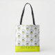 Sac fourre-tout réversible élégant imprimé à l'avant et à l'arrière avec des verres de cocktail en gin dessinés à la main avec de la glace, des tranches de citron et des bulles. Il y a une bande personnalisable à l'avant et à l'arrière pour ajouter votre propre nom ou message
