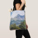 Sac fourre-tout avec une photo de majestueux paysage d'été. Nous voyons des sommets de montagne, du ciel bleu et des chalets en bois parmi les arbres. Un grand cadeau pour les amoureux de la nature, du tourisme et des randonnées. S'il vous plaît, personnalisez ce sac, en ajoutant votre propre message. Pour d'autres modifications (style de police, couleur de police, position du texte), cliquez sur "Modifier la conception".