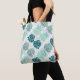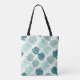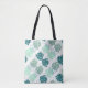 Tote bag with diagonal turquoise and grey tropic monstera leaf pattern.