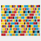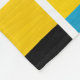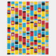A design made up of stripes with hand painted bands, blocks and spots of colour in shades of of red, amber, deep gold, blue, grey black and white. Inspired by painted totems.