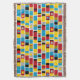 A design made up of stripes with hand painted bands, blocks and spots of colour in shades of of red, amber, deep gold, blue, grey black and white. Inspired by painted totems.
