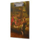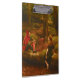 This design features a painting by the British Pre-Raphaelite artist John Collier (1850–1934). It is a richly detailed, character-driven painting that brings to life two secondary figures from Shakespeare’s play "As You Like It". Collier focuses on the unlikely romantic pairing between Touchstone, the court jester, and Audrey, a simple shepherdess. In the play, their relationship is deliberately unpoetic and humorous, a counterpoint to the idealized romances of the main characters. Collier translates and transports this contrast into visual form, creating a portrait of two people whose temperaments, social backgrounds, and attitudes toward love could hardly be more different. Touchstone is rendered with an air of intelligence and sly wit. His brightly colored jester’s costume, complete with elaborate patterns and bold tones, immediately signals his role as a fool, yet his expression also seems to make clear that he is the sharpest observer on the stage. Collier captures him in a moment of poised confidence, leaning slightly toward Audrey with a knowing, almost teasing gaze. The jester’s posture and facial expression suggest that he sees through the absurdities of both courtly and pastoral life, and that his courtship of Audrey is an amused, playful act as much as a genuine pursuit. Audrey, by contrast, is painted with simplicity and sincerity. Her clothing is plain and rustic, and Collier softens her features to convey her innocence and straightforward nature. She sits quietly beside Touchstone, her expression gentle, almost timid. Collier does not exaggerate her simplicity; instead, he allows her modesty to speak for itself, creating a character who is kind, humble and earnest in ways completely unlike her companion. Her presence in the painting brings a sense of grounded calm that balances Touchstone’s clever and playful energy. The setting, likely the Forest of Arden, is depicted with naturalistic detail, providing a peaceful woodland backdrop. This pastoral environment evokes the play’s themes of rustic escape and transformation while also highlighting the tension between courtly artifice (embodied by Touchstone) and rural simplicity (represented by Audrey). Touchstone’s wit and performative personality are seen beside Audrey’s innocence and sincerity, creating a relationship that is both charming and comically mismatched. Through careful characterization, detailed costuming, and a harmonious natural setting, Collier translates Shakespeare’s comic subplot into a vivid and thoughtfully composed image that highlights the enduring appeal of these two unconventional lovers. The original artwork of "Touchstone and Audrey" was painted by John Collier in 1890.