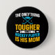 Hockey theme button for the hockey mom with hockey pucks and sticks with text of white, yellow and blue that reads The Only Thing Tougher Than a Hockey Player is His Mom!