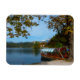 Rectangular photo magnet of traditional colourful tourist boats in Lake Bled under a chestnut tree in fall colours in an autumn landscape in Slovenia.