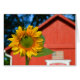 Un tournesol se tient contre le contexte d'une grange rouge avec un drapeau américain. Le tournesol (helianthus annuus) est un indigène annuel de plante en Amériques. Le tournesol est la fleur d'état du Kansas. Sur le dos de la carte, une abeille visite un tournesol. Les abeilles sont les pollinisateurs importants.
