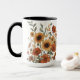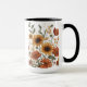 Sirotez votre boisson préférée avec style dans cette tasse d'inspiration boho, avec des tournesols dessinés à la main, des marguerites et des pavots entrelacés de motifs tribaux géométriques dans des teintes chaudes comme la terre cuite, l'orange brûlée et le vert olive. Parfait pour ajouter une touche vintage et libre à votre cuisine ou bureau. OEuvre botanique haute résolution conçue exclusivement pour l'impression sur demande.