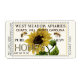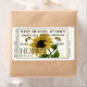 Étiquette d'ivoire pâle avec une bordure en pointillé vert et illustration vintage de tournesol avec abeilles. Le miel est écrit sur le tournesol en gros relief.