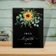 Un arrière - plan noir. Décoré de tournesols, de verdure d'eucalyptus. Ajoutez un nom, du texte. Le nom est écrit avec un script de style moderne écrit à la main avec des swashes. Pour que les swashes ne suppriment que le nom de l'échantillon, laissez les espaces ou émoticônes devant et après le nom.