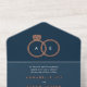 Un monogramme moderne obtient glam avec de vrais anneaux mariage en or rose en feuille métallique entrelacé et facile à personnaliser le texte, ce qui en fait une nouvelle faire-part de mariage classique avec du texte simplifié en blanc et brouillé sur un arrière - plan bleu marine profond. Éditer tout le texte de ce budget convivial tout en une invitation pour une invitation personnalisée, simple classique qui résistera à l'épreuve du temps.