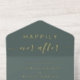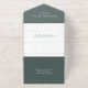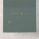 Élégante faire-part de mariage tout-en-un vert sauge foncé avec "Happily Ever After" présentée dans un mélange de lettres simples et d'un script chic avec des swashes, les détails de votre invitation, et une carte postale réponse RSVP déchirante, le tout rendu dans votre choix de feuille d'or véritable, argent ou rose.