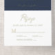Élégante faire-part de mariage tout-en-un bleu marine foncé avec vos initiales monogrammes à l'intérieur d'une crête de mariage vintage, vos noms, "Réception à suivre" et "Rsvp" présenté dans un script chic, vos détails d'invitation dans la typographie serif classique, et une carte postale de réponse RSVP déchirante blanche, le tout rendu dans votre choix d'or, argent ou rose. Si vous le souhaitez, vous pouvez ajuster la taille du script pour des noms plus longs ou plus courts en modifiant l'outil de conception.