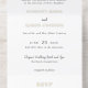 Élégante feuille tout en un faire-part de mariage avec un design simple avec vos détails d'événement dans les polices serif et script. Les accents sont imprimés en papier d'aluminium et la carte RSVP ci-jointe comprend des choix de repas pour vos invités.