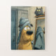 A freshly bathed pup in a towel turban spots a cheeky black cat perched on the bathroom shelf. Mirror, robes, and cozy details set the scene for a lighthearted, family-friendly build. Perfect for kids, pet lovers, and anyone who enjoys humourous cartoons. Choose your preferred size and piece count on Zazzle.