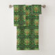Towels with a vibrant tree of life pattern in green and brown, featuring circular motifs. The design is earthy and nature-inspired, creating a calming vibe.