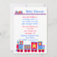 Stylish baby shower invitation, in white, blue, green, yellow, and red. Sweet graphics of a colourful train decorates the top and bottom of the invitation. Personalize the blue and red text to suit your shower party needs. Adorable invitation.