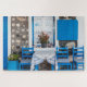This gorgeous puzzle features a traditional whitewashed restaurant with table and chairs outside in the village of Oia, on the southwestern tip of Santorini, Greece.