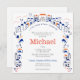 Invitation de Tradition Bar Mitzvah, entourée de la frontière de Jérusalem en or et en bleu avec la phrase si j'oublie Jérusalem, que ma main droite oublie sa ruse en hébreu, אם אשכחך ירושלים תשכח ימיני