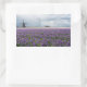 Souvenir photo sticker of a landscape with a traditional windmill and multiple modern windmills to generate green energy behind a field with purple hyacinth flower in the Bulb Region in Holland.
