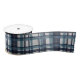 This ribbon features a traditional preppy plaid pattern in navy and other shades of blue, with a subtle gold thread.