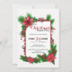 Classic and stylish Christmas elegant dinner party invitation with fir branches and poinsettia flowers around a red frame on the front side and a Christmas wreath on the back.