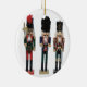 This tree ornament features three colourful, traditional, wooden Christmas Nutcracker soldiers, one with an axe, one with cymbals, and one with a sword.