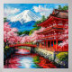 Beautiful traditional Japanese architecture surrounded by cherry blossoms, a serene river, and a mountainous backdrop, showcasing peaceful harmony amidst vibrant colours and cultural elegance.