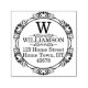 A traditional circular personalized self-inking stamp design featuring a decorative retro border with elegant typographic ornaments, monogram initial, name and return address text.