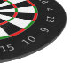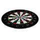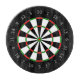 Round glass cutting board with an authentic traditional regulation dartboard design in black, red and green.