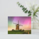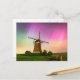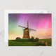 Photo postcard of a traditional windmill under a colorful sky with Northern Lights (aurora borealis) and stars at night in the countryside at Leidschendam in the Netherlands (Europe). It’s very rare for the weather phenomenon to be experienced this far south.