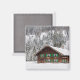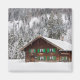 Photo magnet with a traditional wooden log cabin house with green shutters in a forest in the snow in winter in Bavaria at the border between Germany and Austria.