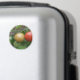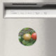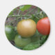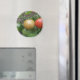 This beautiful magnet features a photograph of a bunch of ripening tomatoes including a red, orange and green cherry tomato in a line, growing on a tomato plant in a suburban garden. The photograph was taken using macro photography for a detailed result.