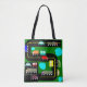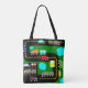 This tote bag has a geometric design of trucks and cars on a road and in a parking lot. Use it for the kids toys when shopping, at the beach, or on vacation.