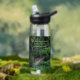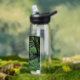 Stay quenched wherever you go with this clear, plastic water bottle that features the photo image of a hiking trail leading into a deep forest over a wooden footbridge along with an inspiring quote by naturalist John Muir and printed in green lettering that reads, "And into the forest I go to lose my mind and find my soul." Select your water bottle size and colour. NOTE: Design not optimized for child's water bottle style.