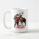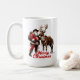 This image features a Western-style Santa standing proudly beside his trusty reindeer, who is saddled up like a pack animal for a long journey. Santa wears a cowboy hat and his traditional red suit, complete with a large, overflowing backpack. He has his hand gently on the reindeer, conveying a bond of camaraderie. The phrase "Merry Christmas" in bold red script beneath them completes this unique, rugged holiday scene.