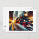 A powerful steam locomotive speeds through a vibrant train station, evoking a sense of motion and energy. Warm lights illuminate the scene, contrasting with the dynamic motion lines that suggest rapid movement.