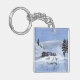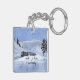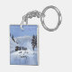 A watercolor painting of a train in a winter snowscape adorns this customizable keychain!