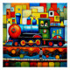 A.I .assisted print of a child in the foreground observes a vibrant, colorful scene features a whimsical train with children peering out from the windows against a backdrop of geometric buildings.