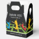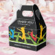 Kids birthday thank you party favour boxes featuring a plain black backdrop, trampoline courts, kids jumping and flying through the air, and a thank you template that is easy to customize.
