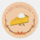 Sticker au design Thanksgiving. Un morceau souriant de tarte citrouille garni de crème fouettée est entouré d'un cadre saisonnier de feuilles d'automne et de branches décoratives. Au-dessus de la conception les mots "Bon thanksgiving" montrent. Ces mots peuvent être customisés comme vous voulez.