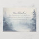 This wedding enclosure card features a serene, misty forest scene with tall pine trees in varying shades of blue-green, creating a dreamlike and tranquil atmosphere. The design employs a watercolor or digital painting style, characterized by soft edges and gentle blending of muted blues and grays, evoking a cool, peaceful mood. Elegant script typography highlights the phrase "the details," while simpler serif font provides additional information, ensuring readability and sophistication. The overall layout is centered and well-spaced, utilizing negative space effectively to focus attention on the text, making it perfect for conveying important wedding information with an inviting tone.
