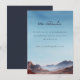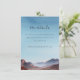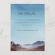 This wedding enclosure card features a serene watercolor landscape with layered mountains in soft blues and purples, contrasted by warm reddish-brown hills. The sky transitions from light to deep blue, creating a tranquil atmosphere. Elegant cursive typography highlights "the details," while simple sans-serif text provides additional information. The design's semi-realistic style evokes relaxation and anticipation, making it perfect for sharing wedding event specifics.
