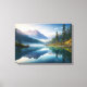 A serene mountain landscape painting depicting a glassy lake reflecting the dawn's light, featuring muted blues and rich green foliage. This artwork evokes tranquillity and a love for nature.