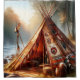 Nestled by a flowing river, a native Indian teepee stands proudly among lush trees and majestic mountains, inviting peaceful reflections and a deep connection with nature's beauty.