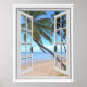 Tropical beach Ocean view, fake window scene, for a windowless office wall. Fun, realistic optical illusion scenic poster for an office or study wall.
