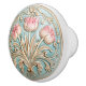The "Tranquil Tulip Trio Ceramic Knob" showcases an exquisite arrangement of three tulips, rendered in soft pink and cream hues that evoke a sense of tranquillity and grace. The flowers are surrounded by lush, flowing leaves and intricate detailing, all highlighted with subtle golden accents. Set against a calming aqua background, the design exudes a timeless elegance that is characteristic of the Art Nouveau movement. The harmonious blend of colours and the meticulous craftsmanship make this knob not just a functional piece but a work of art. Perfect for those who appreciate the fusion of utility and beauty, this ceramic knob will enhance the aesthetic of any room with its graceful and refined presence.