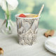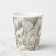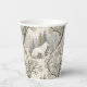 This serene winter forest paper cup features a majestic white wolf at its centre, surrounded by snow-dusted trees in soft tones of cream, brown, grey, and pale blue. A second wolf is subtly nestled in the lower corner, hinting at unseen life within the quiet woodland. With a mix of bare-branched and evergreen trees, framed by delicate decorative elements, this design evokes natural beauty, stillness, and a touch of winter magic. Perfect for nature lovers, animal enthusiasts, and seasonal or fantasy-themed settings.