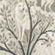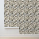 This serene winter forest wallpaper features a majestic white wolf at its centre, surrounded by snow-dusted trees in soft tones of cream, brown, grey, and pale blue. A second wolf is subtly nestled in the lower corner, hinting at unseen life within the quiet woodland. With a mix of bare-branched and evergreen trees, framed by delicate decorative elements, this design evokes natural beauty, stillness, and a touch of winter magic. Perfect for nature lovers, animal enthusiasts, and seasonal or fantasy-themed settings.