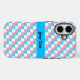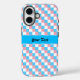 Phone case for Apple iPhone 16 with transgender pride flag of pink, white and blue; chequerboard pattern trans pride design; with a custom text template for your name or message