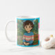 Coffee mug with a trans flag in light blue, pink and white with an anime transgender person in a trans sweater and a pride poem on the back.
