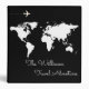 A black background with a white map of the world, and your own family name in a script font-style with custom words 'Travel Adventures'... to collect photos and memories of your travels around the world